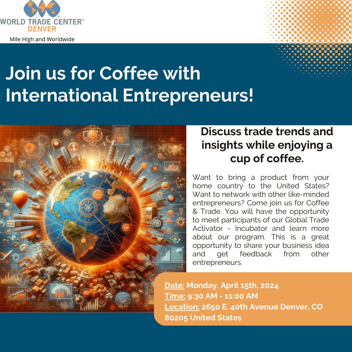 Want to bring a product from your home country to the United States? Want to network with other like-minded entrepreneurs? Come join us for Coffee & Trade. You will have the opportunity to meet participants of our Global Trade Activator - Incubator and learn more about our program. This is a great opportunity to share your business idea and get feedback from other entrepreneurs.