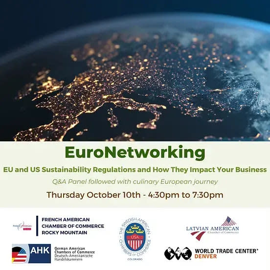 This event is co-organized by the French American Chamber of Commerce Rocky Mountain, the German American Chamber of Commerce Colorado, the World Trade Center Denver, the Latvian Chamber of Commerce Colorado, and the Swedish-American Chamber of Commerce Colorado.
