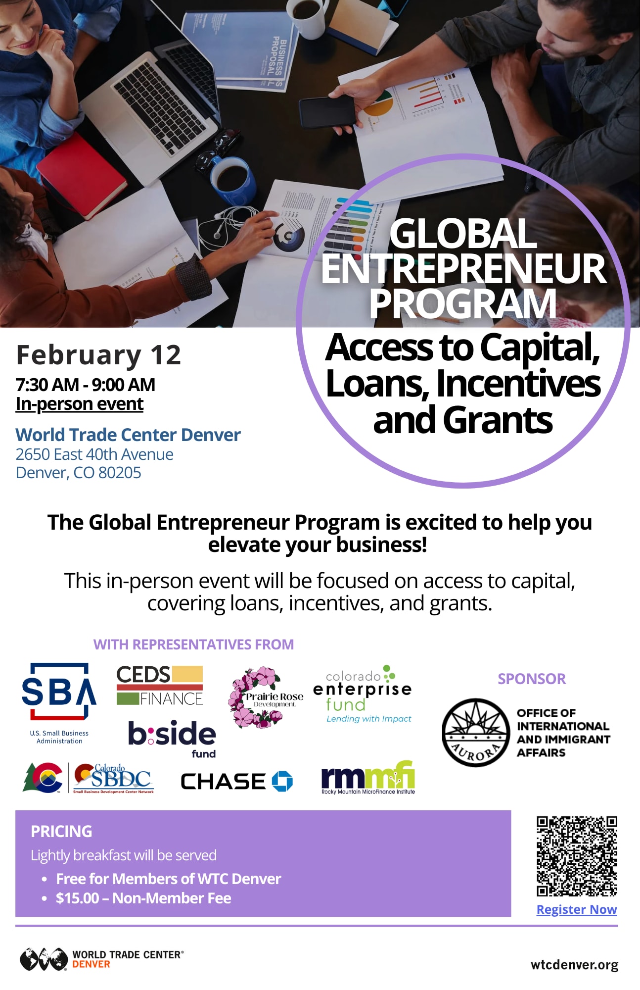 The Global Entrepreneur Program is excited to help you elevate your business! This in-person event will be focused on access to capital, covering loans, incentives, and grants.