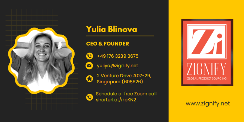 Yulia Blinova (余莉). Founder of Zignify Global Product Sourcing. Co-founder of 2 Amazon brands. She has 18 years of experience in global product sourcing, supply chain, logistics, import/export and e-commerce fields.